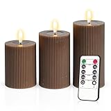 Meisterhome® 3er-Set Flammenlose LED Kerzen - Braun - Ribble Design Stumpenkerze - mit Fernbedienung – mit Timer - Batteriebetrieben – Warmweiß - 10/12, 5/15 cm hoch - mit flackernder Flamme